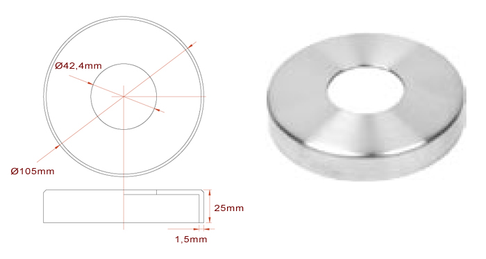 Ce cache embase inox A4 316 de finition satinée est destiné à recouvrir le support au sol de rampe ou main courante.Sa finition satinée permet d'apporter une finition soignée aux poteaux inox. Caractéristiques : - Ø extérieur 105mm - Hauteur 25mm - Alésage pour tube Ø42,4mm [04-007X-16S] Détails