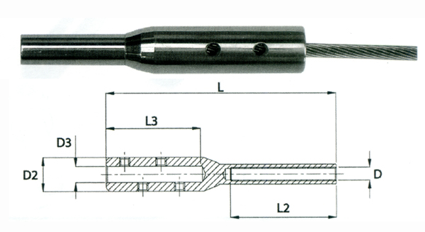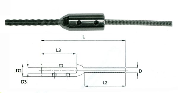 Cet embout pour cable Ø6mm est en acier inoxydable AISI316. Il convient à un raccordement direct sur un poteau avec insert M6 d'un côté. L'autre extrémité recevant un cable inox Ø6mm qui sera bloqué par 3 vis de serrage.