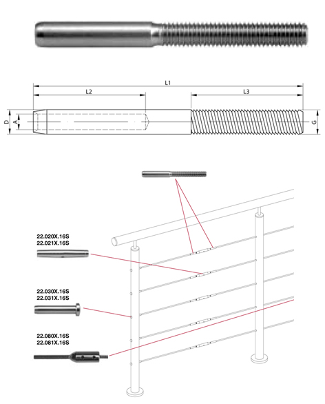 Embout filetée à droite Ø6mm 316 Tendeur Embout à sertir 22-011X-16S