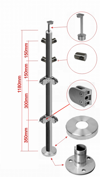Ce poteau de départ de rampe ou d'escalier généralement installé en extérieur est en acier inox A4 (316) d'aspect satiné. Il est livré équipé de :